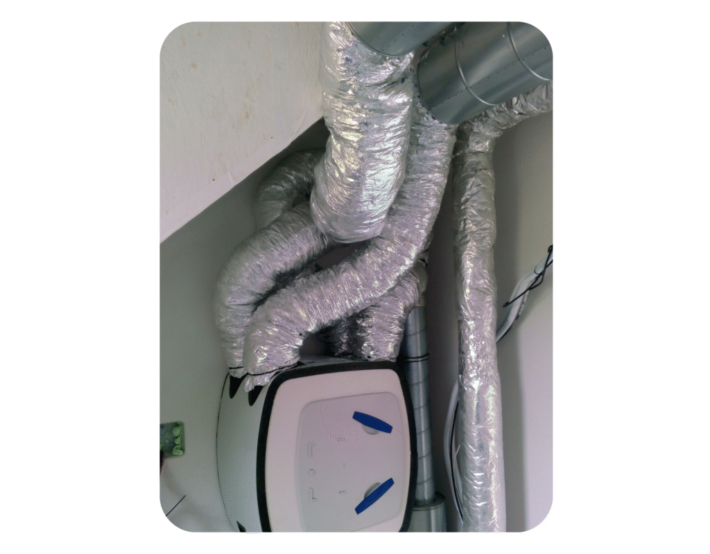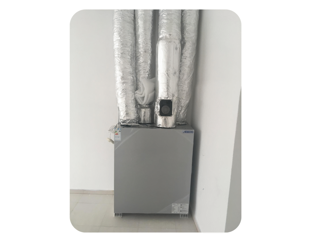V rodinném domě v Příbrami jsme instalovali centrální rekuperační jednotku, která zajišťuje stálý přívod čerstvého vzduchu bez tepelných ztrát. Jednotku jsme umístili do technické místnosti a napojili na hlavní rozvody vzduchu. Celý systém jsme navrhli s ohledem na tichý provoz a jednoduchou údržbu.